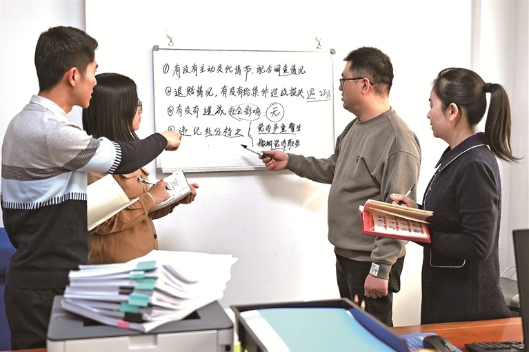 山東省萊西市紀(jì)委監(jiān)委在監(jiān)督執(zhí)紀(jì)執(zhí)法中注重統(tǒng)籌把握具體情形,準(zhǔn)確運(yùn)用“四種形態(tài)”,有效發(fā)揮層層設(shè)防的作用。圖為該市紀(jì)檢監(jiān)察干部正在研究案件,確定應(yīng)該適用哪種形態(tài)處理。秦蒞博 攝