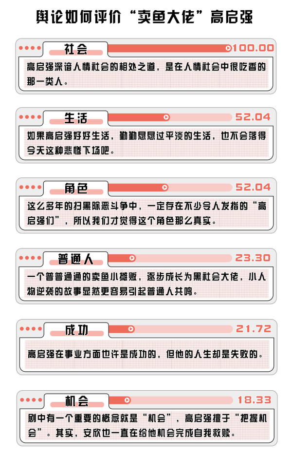 (制作:法治網(wǎng)輿情中心 數(shù)據(jù)來源:收集知乎問題“如何評價《狂飆》中張頌文飾演的高啟強?”下的384個回答,對選取的回答進(jìn)行數(shù)據(jù)清洗及自然語言處理,將熱度最高的詞語規(guī)定為100,并舉例子)