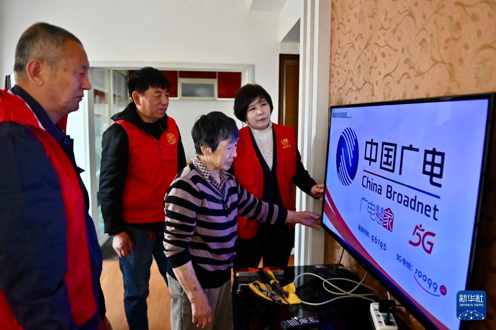 4月11日,馬鳳俠(右一)和志愿者一起幫社區(qū)內(nèi)的孤寡老人安裝電視。