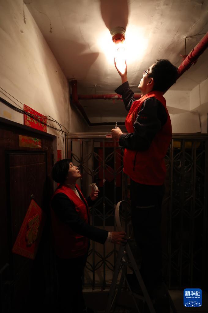 4月11日,在福康社區(qū)一樓道內(nèi),馬鳳俠(左)和志愿者在換燈泡。