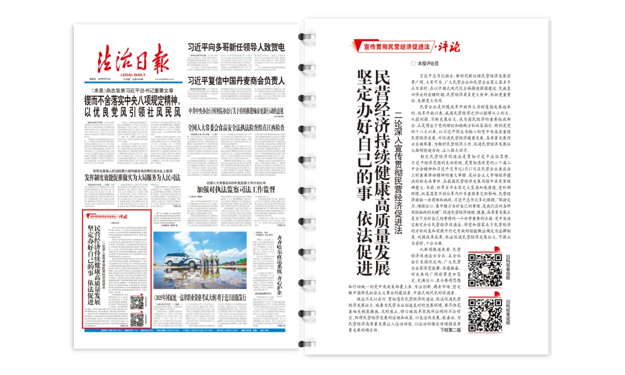 制定民營經濟促進法是貫徹習近平法治思想、習近平經濟思想的生動實踐,是貫徹落實黨的二十屆三中全會精神和習近平總書記2月17日在民營企業(yè)座談會上的重要講話精神的重大舉措,是社會主義市場經濟建設的標志性事件,在我國民營經濟發(fā)展歷程中具有里程碑意義。當前,世界百年未有之大變局加速演進,受外部環(huán)境、政策落實不到位等內外多重因素交織影響,民營經濟面臨一些困難和挑戰(zhàn)。習近平總書記多次強調,“保持定力,增強信心,集中精力辦好自己的事情,是我們應對各種風險挑戰(zhàn)的關鍵”。促進民營經濟持續(xù)、健康、高質量發(fā)展正是當下辦好自己的事情的一個非常重要的方面。黨中央決定制定出臺民營經濟促進法,將黨和國家關于民營經濟的方針政策和實踐中行之有效的經驗做法確定為法律制度,鞏固改革成果,依法促進民營經濟發(fā)展壯大,可謂正當其時、十分必要。