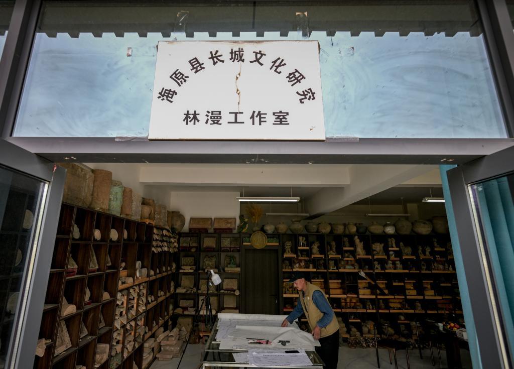 5月12日,李世翔在海原縣博物館旁的工作室中整理圖紙(林漫是他的筆名)。