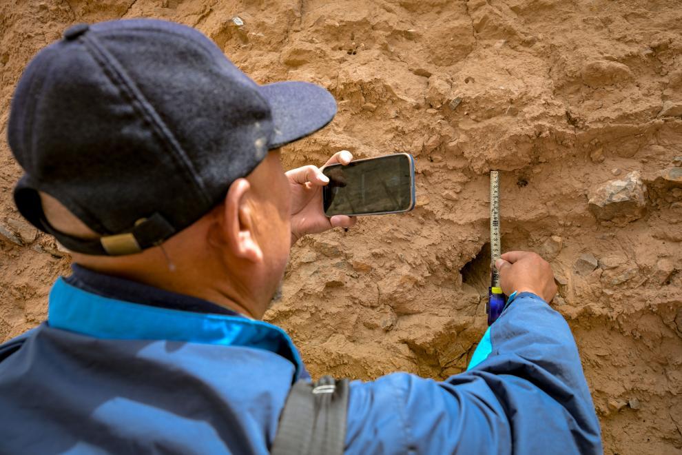 5月13日,李世翔在黃河黑山峽考察途中測量一處秦長城夯土層。