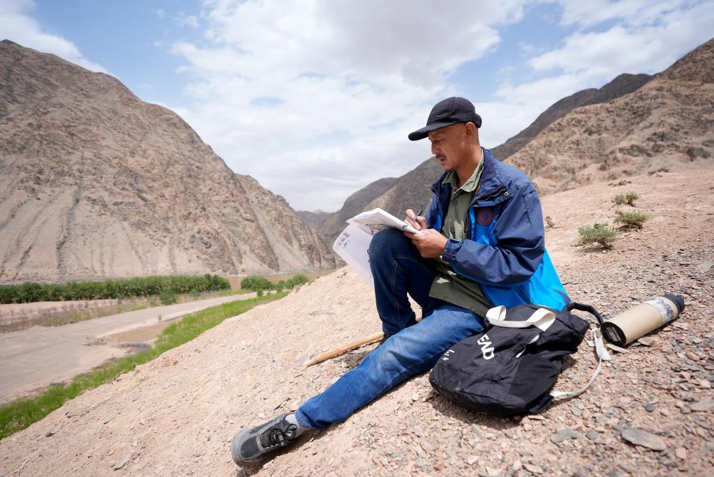 5月13日,李世翔在黃河黑山峽考察途中完善繪制的圖紙信息。