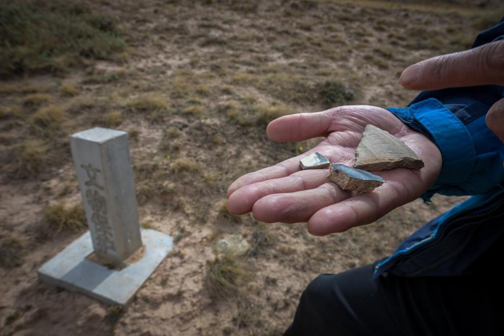 5月12日,李世翔展示散落在甯韋堡附近的瓷片。