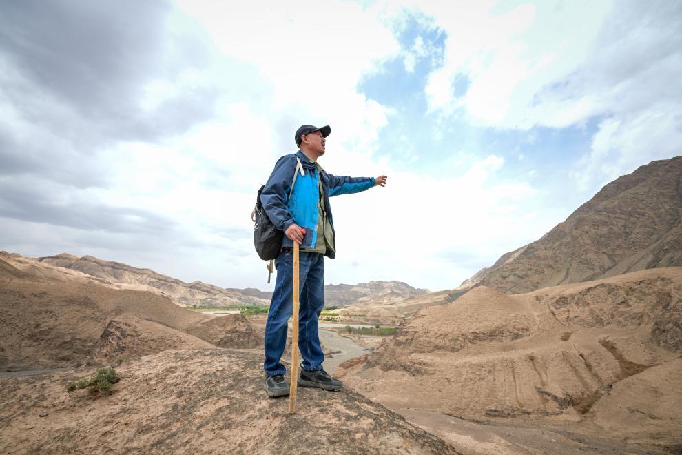 5月13日,李世翔在黃河黑山峽考察途中,站在一處秦兵營遺址上遙指對面山上的長城。