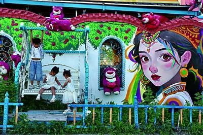 兒童在新疆伊犁特克斯縣一家手工冰激凌店前玩耍。光明日報(bào)記者 閆匯芳攝