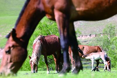 新疆伊犁新源縣那拉提“河谷草原”,正在食草的馬群。光明日報(bào)記者 閆匯芳攝