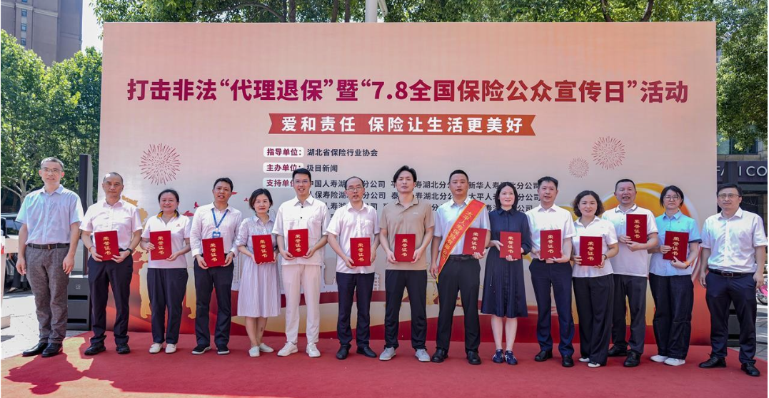 活動現(xiàn)場,大家人壽湖北分公司代表與12家金融機構(gòu)代表聯(lián)合發(fā)起倡議,鄭重宣讀《打擊非法代理退保承諾書》,展現(xiàn)行業(yè)堅決打擊非法“代理退?!焙诨耶a(chǎn)的決心。國家金融監(jiān)督管理總局湖北監(jiān)管局、湖北省保險行業(yè)協(xié)會和極目新聞相關(guān)領(lǐng)導(dǎo)共同為現(xiàn)場保險公司頒發(fā)“打擊非法‘代理退?!蠕h單位”榮譽證書,倡議行業(yè)助力保險消費者守護好“錢袋子”。
