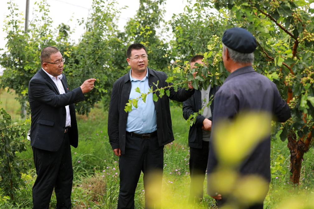 在富民新村的經(jīng)濟(jì)林栽植區(qū),古浪縣委組織部常務(wù)副部長俞永文(左二)與富民新村黨委書記兼村委會主任張延堂(左一)在和種植戶交流。新華社記者 郭剛 攝
