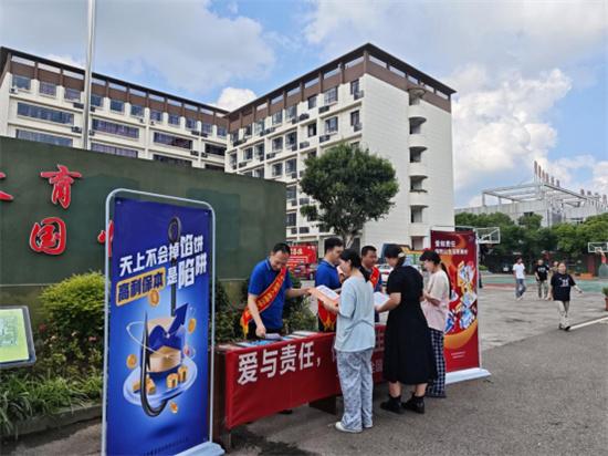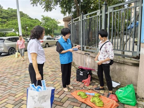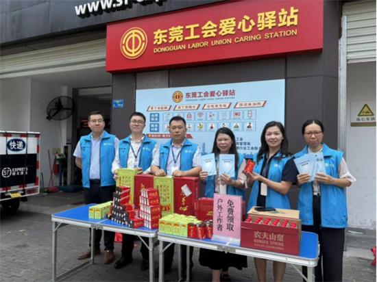 在東莞市匯峰中心,前海人壽東莞分公司的志愿者搭建起服務站點,為環(huán)衛(wèi)工人、快遞員、外賣員等戶外工作者送上清涼飲品,同時結合宣傳材料講解電信詐騙手法和防范要點,在送上夏日關懷的同時有效提升群眾金融風險防范意識。