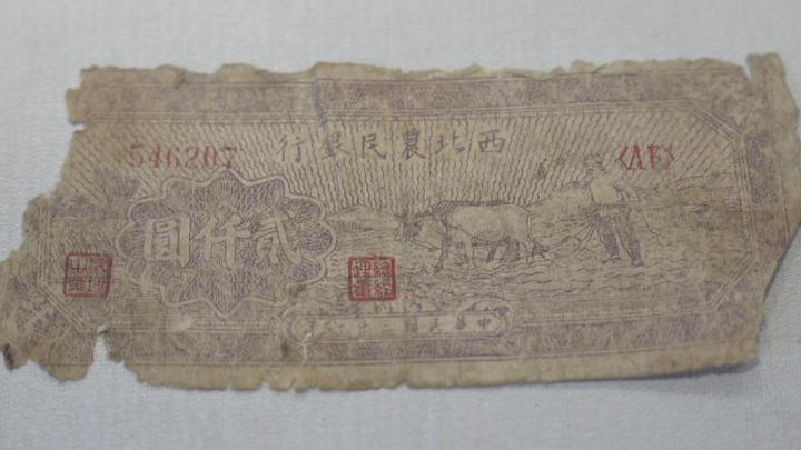 圖為西北農民銀行發(fā)行的紙幣,面額為2000元。新華社記者 原勛 攝