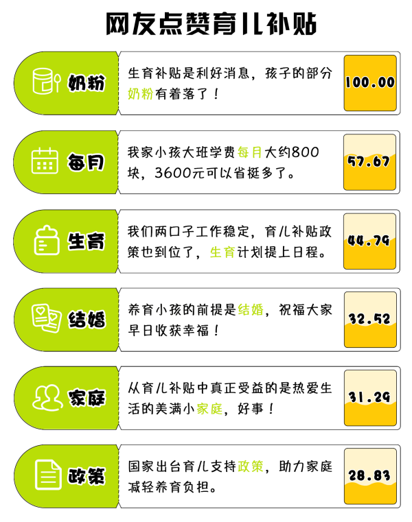 對相關(guān)輿論進(jìn)行分析發(fā)現(xiàn),有網(wǎng)民認(rèn)為,國家出臺(tái)育兒補(bǔ)貼相關(guān)政策,在一定程度上幫助了有娃家庭減輕養(yǎng)育負(fù)擔(dān)。有網(wǎng)民從實(shí)際生活出發(fā),表示3600元可以幫助其解決日常養(yǎng)娃部分開銷,例如孩子上幼兒園的部分費(fèi)用、奶粉錢等。未婚未育或者已婚未育的群體也表示,國家出臺(tái)的政策和福利定會(huì)對生育起到正向推動(dòng)作用。對于年輕人來說,找到一份穩(wěn)定的工作、開啟一段幸福的婚姻、享受國家的福利政策保障,正是他們所期許的。