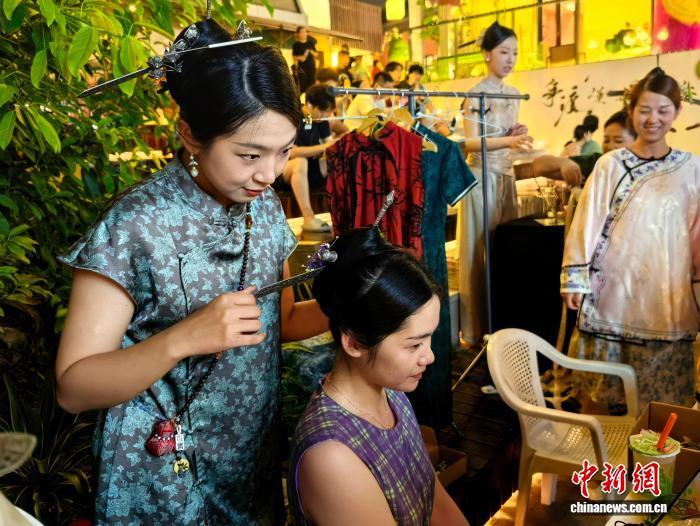 8月23日晚,福州煙臺山歷史風(fēng)貌區(qū)的街巷熙熙攘攘,游客摩肩接踵。在鹽倉的三條簪非遺體驗(yàn)現(xiàn)場,工作人員正在給一位女孩邊梳妝邊講解頭飾背后的文化寓意,不少路過的游客圍攏觀看,有的女孩也在一旁躍躍欲試。