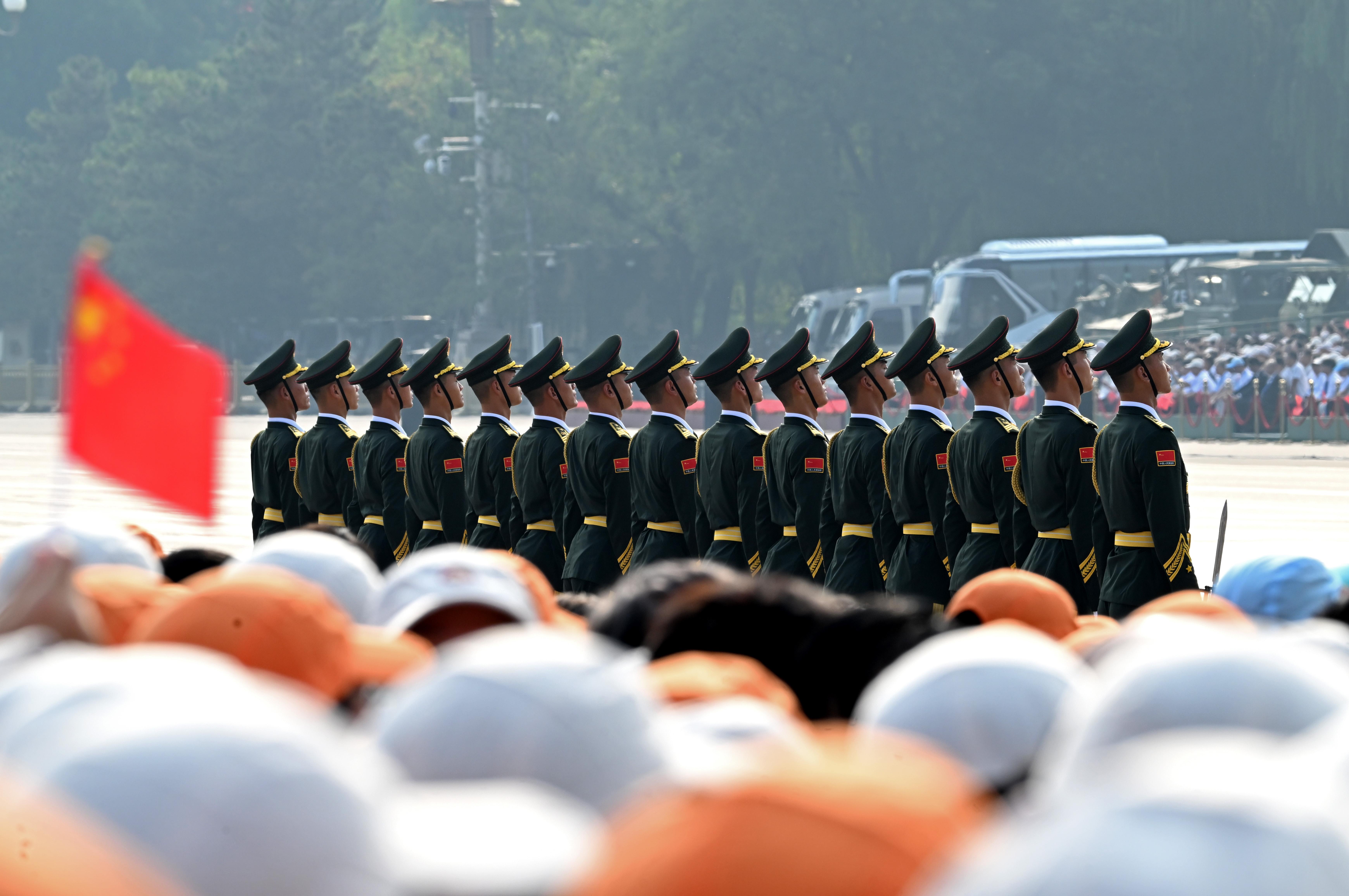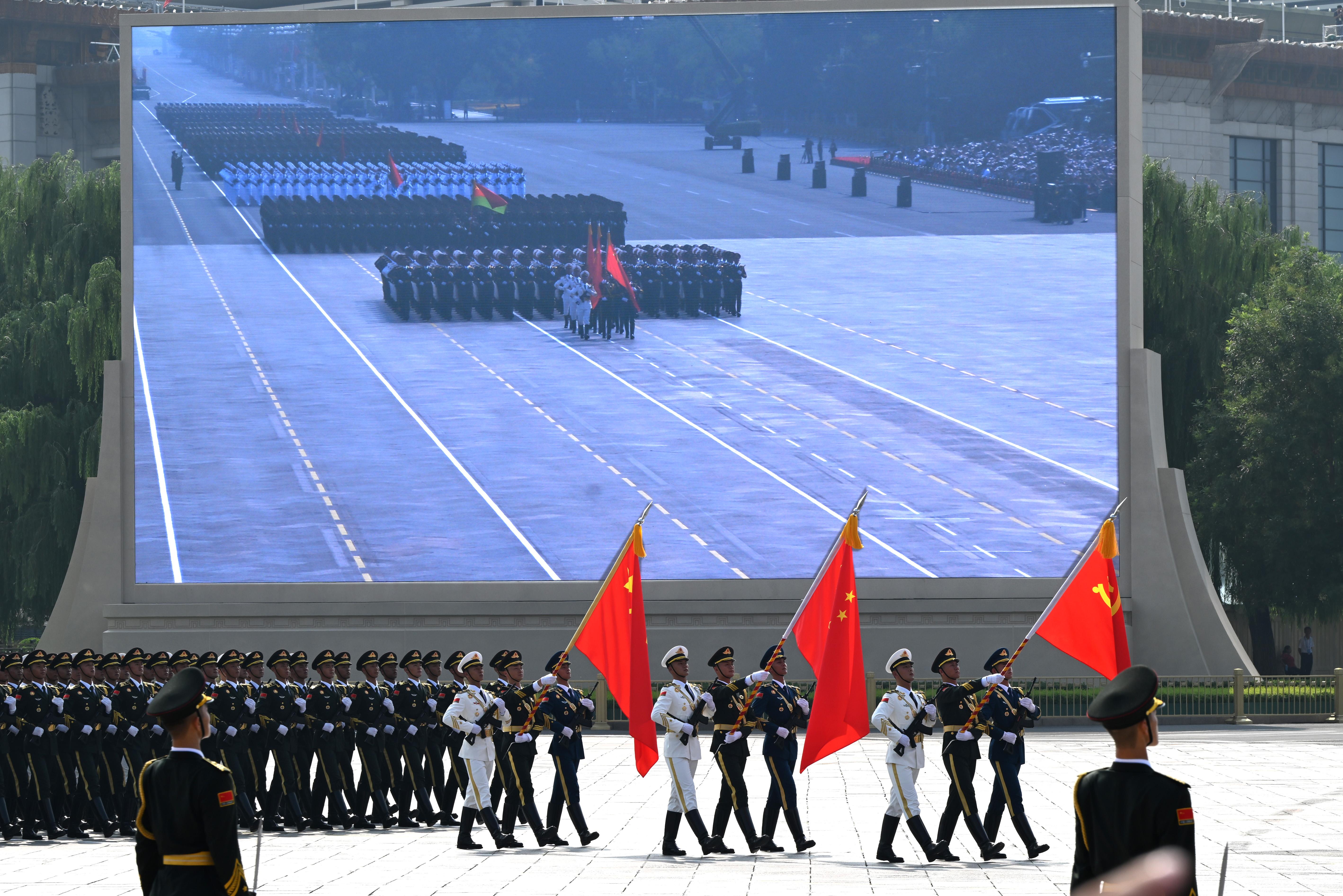 9月3日,紀(jì)念中國人民抗日戰(zhàn)爭暨世界反法西斯戰(zhàn)爭勝利80周年閱兵式在北京隆重舉行。這是天安門廣場舉行升國旗儀式。