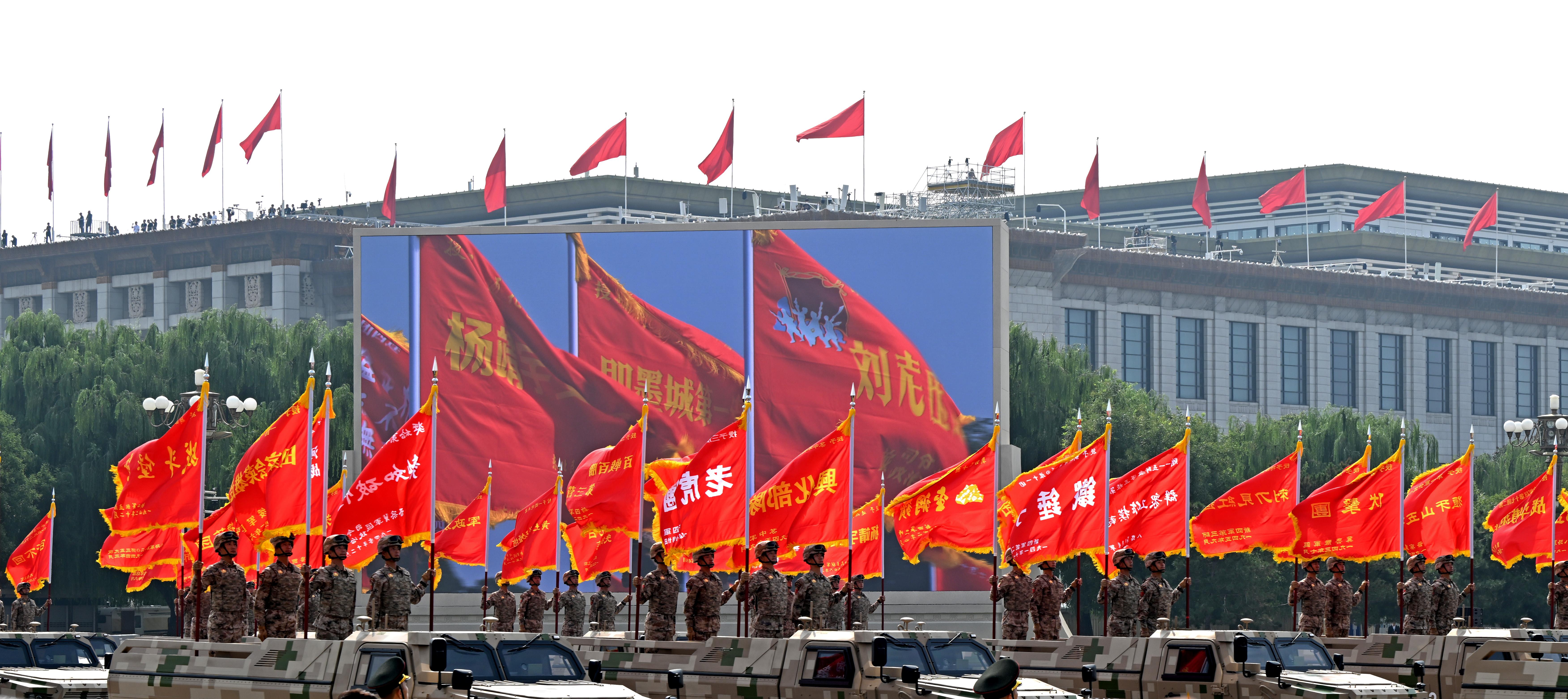 由80面抗戰(zhàn)英模部隊榮譽旗幟組成的戰(zhàn)旗方隊接受檢閱。