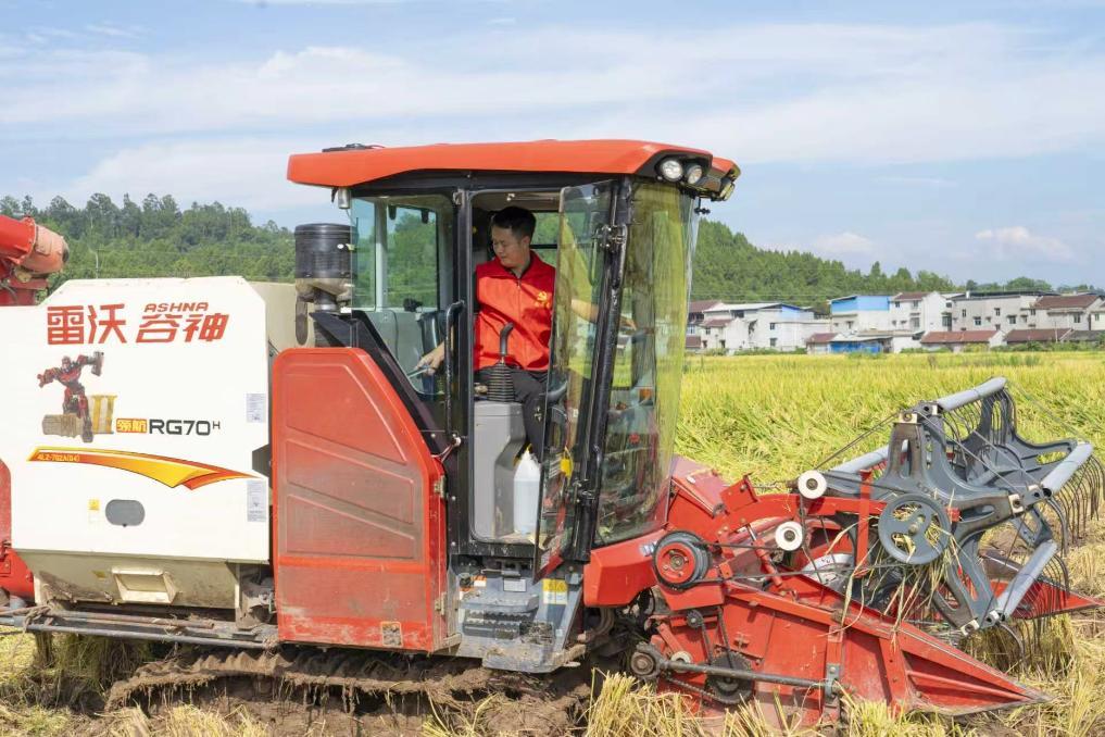 隊員們分工明確,農(nóng)機手操作收割機脫粒,其他黨員有的收割田邊稻谷,有的蹲在田埂撿拾散落稻穗。