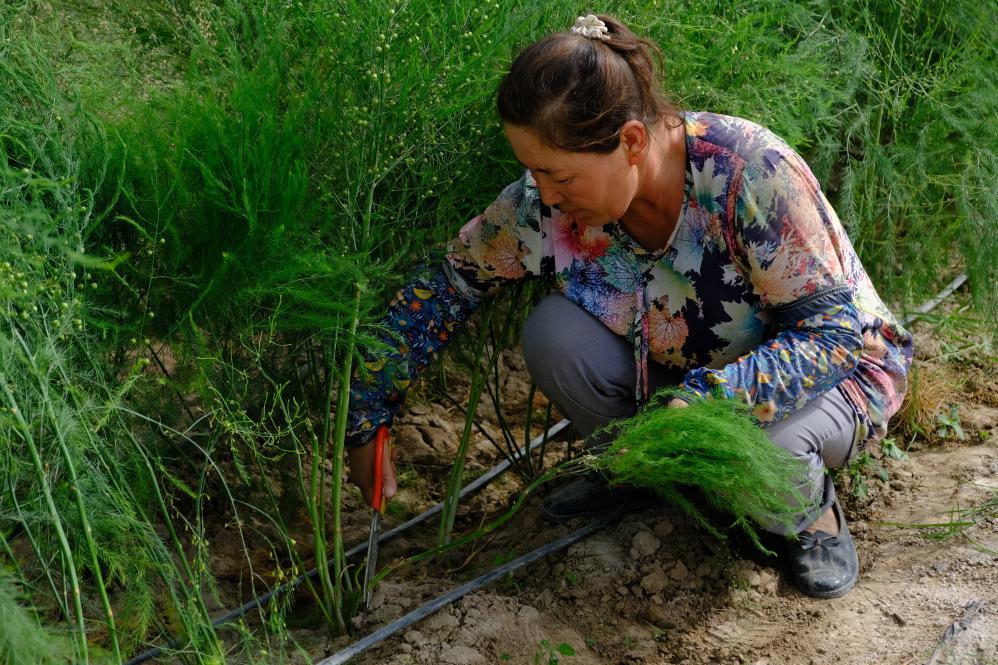 8月14日,在新疆阿克陶縣蘆筍種植基地,工作人員在采摘蘆筍。新華社記者 檀易曉 攝