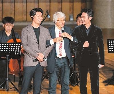 電影《狼圖騰》導(dǎo)演讓?zhuān)趴恕ぐ⒅Z(前排左二)與中國(guó)演員馮紹峰(前排右一)、竇驍在“光影百年·中法同行”電影音樂(lè)會(huì)上互動(dòng)。 新華社記者 謝晗攝