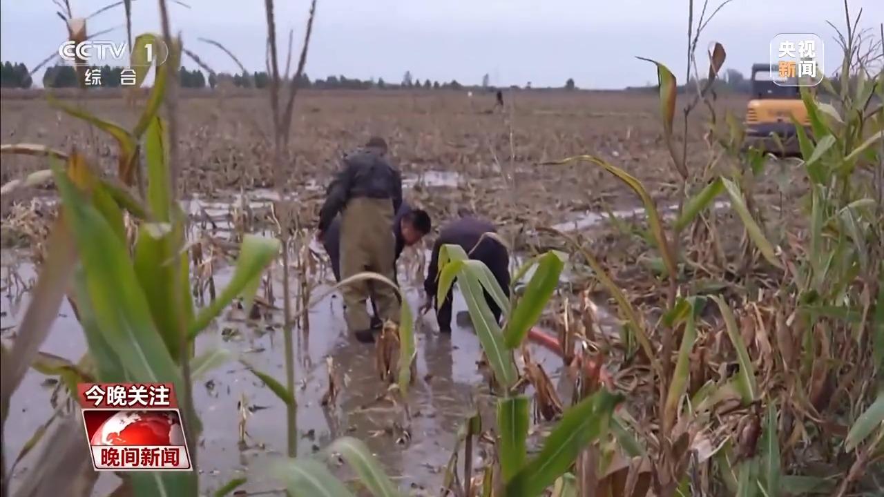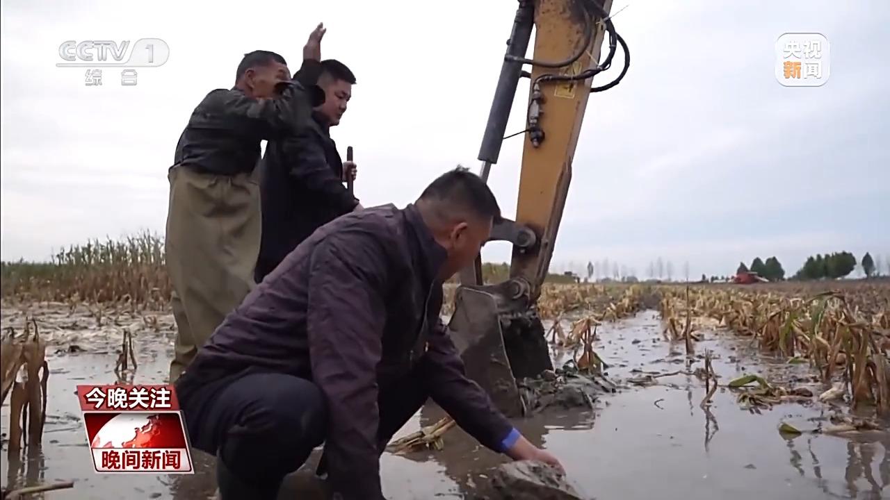 村鎮(zhèn)干部調(diào)來挖掘機和抽水泵,抽排積水。凌晨1點多,積水基本排干,收割機和志愿者一起上手搶收。