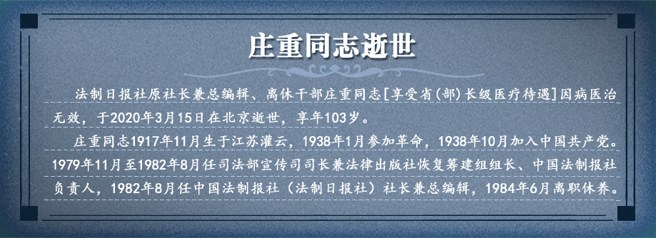莊重老社長逝世,我很悲慟。悲慟之余,他在法制報創(chuàng)辦初期的感人事跡浮現在我的腦海中。 1979年,中央組織部向在京各部委發(fā)文,要求抽調一批干部支援公安部、最高檢、最高法、司法部、民政部、安全部。莊重同志于1979年11月調入司法部,分配在宣傳司為負責人,同時領導籌備法制報,這時宣傳司與法制報為同一個單位,兩年后分開。分開時莊重為宣傳司司長、法制報社黨委書記、社長、總編輯,一時身兼四職,可見人氣十足。【詳細】