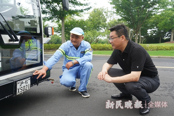 圖說:諸巨明代表(右)實(shí)地調(diào)研環(huán)衛(wèi)車輛。新民晚報(bào)首席記者 劉歆 攝