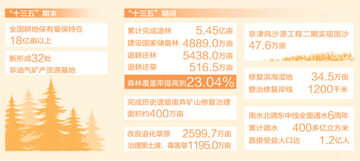 各類自然資源保護(hù)狀況總體良好。“十三五”期末,全國耕地保有量保持在18億畝以上,為確保谷物基本自給、口糧絕對安全提供耕地資源保障。新形成32處非油氣礦產(chǎn)資源基地,錳、鋰、石墨等戰(zhàn)略性礦產(chǎn)儲量大幅增長,勘探發(fā)現(xiàn)瑪湖等17個(gè)億噸級大油田,安岳等21個(gè)千億立方米級大氣田?!笆濉逼陂g,累計(jì)完成造林5.45億畝,建設(shè)國家儲備林4889.0萬畝,退耕還林5438.0萬畝,退耕還草516.5萬畝,森林覆蓋率提高到23.04%;完成歷史遺留廢棄礦山修復(fù)治理面積約400萬畝;改良退化草原2599.7萬畝,治理黑土灘、毒害草1195.0萬畝;京津風(fēng)沙源工程二期實(shí)現(xiàn)固沙47.6萬畝;修復(fù)濱海濕地34.5萬畝,整治修復(fù)岸線1200千米。南水北調(diào)東中線全面通水6周年,累計(jì)調(diào)水400多億立方米,直接受益人口達(dá)1.2億人。地質(zhì)災(zāi)害造成死亡(失蹤)人數(shù)和直接經(jīng)濟(jì)損失較“十二五”期間分別減少38.5%和41.5%。