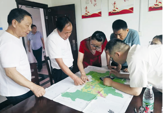 王書(shū)華(中)與村、企業(yè)負(fù)責(zé)同志共同研究破解項(xiàng)目落地問(wèn)題。