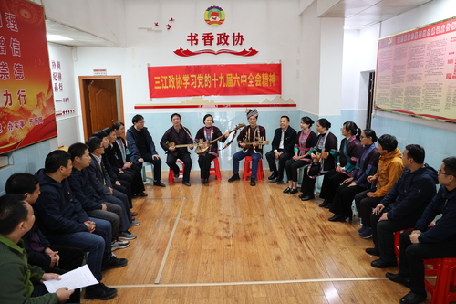 “琵琶到手歌就唱,講個(gè)黨的故事給你聽,六中全會(huì)精神拿來唱……”11月19日,在廣西壯族自治區(qū)柳州市三江侗族自治縣政協(xié)辦公室,政協(xié)機(jī)關(guān)干部和部分政協(xié)委員在富有侗族特色的琵琶歌中領(lǐng)悟黨的十九屆六中全會(huì)精神。 梁克川 攝
