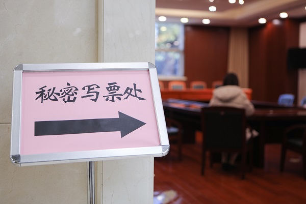 投票站內(nèi)氣氛莊重嚴肅、設(shè)置井然有序。五星紅旗鮮艷奪目,懸掛正中,三個投票箱呈品字型端立前方,票箱上鑲嵌的國徽熠熠生輝,驗證處、領(lǐng)票處、寫票處、秘密寫票處分區(qū)設(shè)置,印有三名正式代表候選人基本情況的展板擺放醒目,方便選民了解情況。