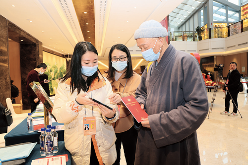 “掌上”辦公是福建省政協(xié)十二屆五次會議的一大亮點(diǎn)。政協(xié)委員收集到的社情民意、百姓心聲,可通過“掌上”辦公,形成全流程覆蓋、全天候在線的履職形態(tài)。圖為工作人員在會議間隙指導(dǎo)委員如何使用“掌上”辦公系統(tǒng)。     王惠兵 攝