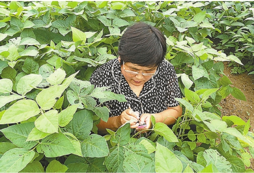王秋玲在精心篩選大豆雜交后代單株并脫粒