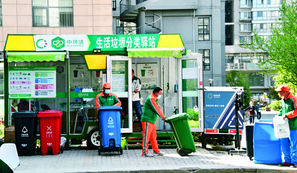 2021年4月17日,工作人員在北京市朝陽(yáng)區(qū)望京街道金隅麗港城社區(qū)的生活垃圾分類驛站進(jìn)行垃圾分類運(yùn)送。攝影/新華社記者?李欣