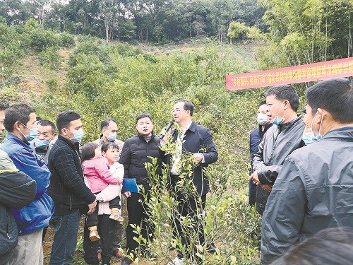 “黃龍病俗稱‘柑橘癌癥’,是一種危害性極大、毀滅性極強(qiáng)的傳染性病害,目前還沒(méi)有有效的治療藥劑,柑橘樹(shù)染病之后只能砍掉以免傳染健康樹(shù)……”2月14日,為搶抓農(nóng)時(shí)助生產(chǎn),充分發(fā)揮政協(xié)作用,廣西壯族自治區(qū)欽州市浦北縣政協(xié)按照“開(kāi)年就開(kāi)干,開(kāi)局就決戰(zhàn)”的要求,迅速部署“鄉(xiāng)村振興 委員行動(dòng)”活動(dòng),積極延伸協(xié)商觸角,推動(dòng)服務(wù)下沉,在平睦鎮(zhèn)良村村的果園里開(kāi)展“柑橘春季管理暨黃龍病綜合防控技術(shù)培訓(xùn)”。圖為市政協(xié)副主席、農(nóng)業(yè)技術(shù)專家李云昌就柑橘黃龍病防治為當(dāng)?shù)胤N植戶授課。覃科棵 攝