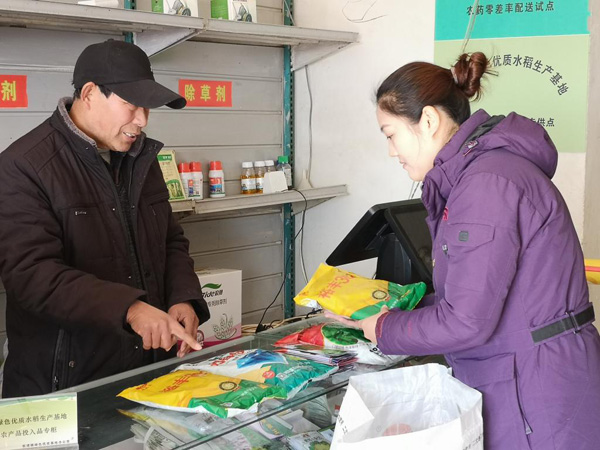 權(quán)太琦(右)在農(nóng)資銷售店詢問價格變化。新華社記者?陸華東?攝