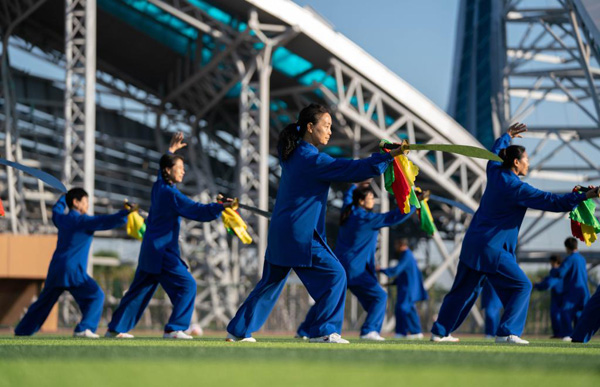 5月27日,市民在河北省黃驊市天健湖共享體育場(chǎng)練習(xí)太極刀。新華社記者?駱學(xué)峰?攝