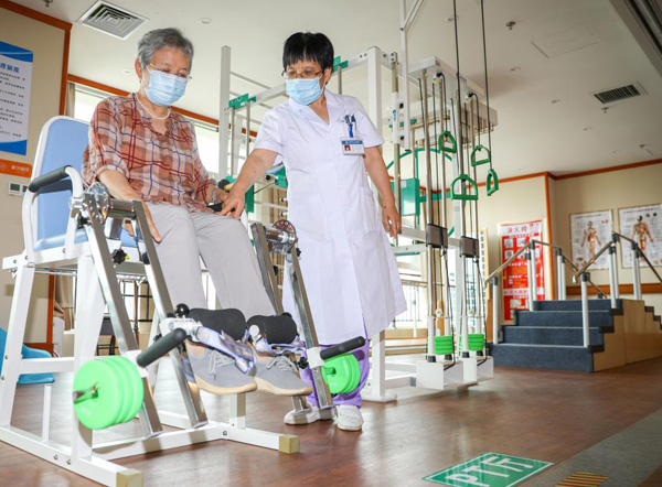 6月20日,在日照頤養(yǎng)公寓,醫(yī)生指導(dǎo)老人通過訓(xùn)練椅進(jìn)行鍛煉。新華社記者?范長(zhǎng)國?攝