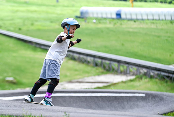 5月28日,一位小朋友在吉林市萬科松花湖度假區(qū)練習(xí)滑板。新華社記者?顏麟蘊(yùn)?攝