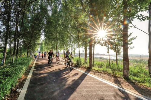 居民在河北省滄州市東光縣大運(yùn)河畔騎行。攝影/新華社記者?駱學(xué)峰
