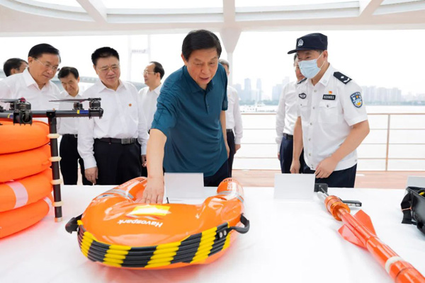 7月3日上午,栗戰(zhàn)書(shū)委員長(zhǎng)和檢查組成員在武漢市漢口江灘碼頭,考察長(zhǎng)江大保護(hù)工作情況。攝影/新華社記者?黃敬文