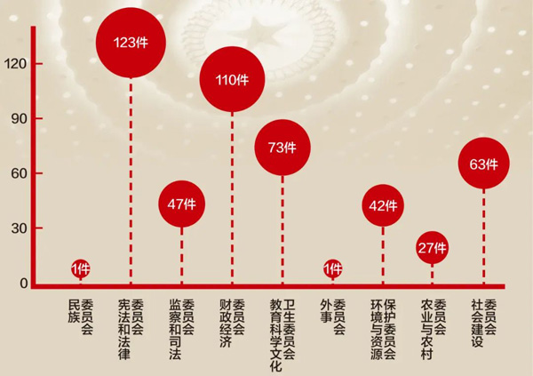 根據(jù)十三屆全國(guó)人大五次會(huì)議主席團(tuán)通過(guò)的代表提出議案處理意見(jiàn)的報(bào)告,十三屆全國(guó)人大五次會(huì)議收到的487件代表議案,分別交由全國(guó)人大9個(gè)專門(mén)委員會(huì)審議。其中,交由民族委員會(huì)審議1件,憲法和法律委員會(huì)審議123件,監(jiān)察和司法委員會(huì)審議47件,財(cái)政經(jīng)濟(jì)委員會(huì)審議110件,教育科學(xué)文化衛(wèi)生委員會(huì)審議73件,外事委員會(huì)審議1件,環(huán)境與資源保護(hù)委員會(huì)審議42件,農(nóng)業(yè)與農(nóng)村委員會(huì)審議27件,社會(huì)建設(shè)委員會(huì)審議63件。