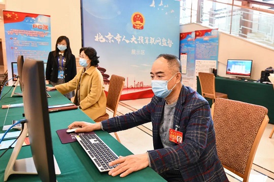 2021年1月,出席市十五屆人大四次會(huì)議的代表查詢北京人大預(yù)算聯(lián)網(wǎng)監(jiān)督系統(tǒng),圍繞“四問(wèn)該不該”提出建議。(北京市人大常委會(huì)供圖)