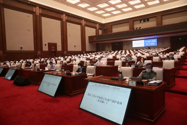 2022年5月25日,北京市十五屆人大常委會(huì)第三十九次會(huì)議表決通過(guò)《北京市中軸線文化遺產(chǎn)保護(hù)條例》,“北京脊梁”領(lǐng)到全方位“法治保護(hù)卡”。(北京市人大常委會(huì)供圖)