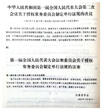 1955年7月30日,根據(jù)法案委員會(huì)的建議,一屆全國(guó)人大二次會(huì)議作出決定:“隨著社會(huì)主義建設(shè)和社會(huì)主義改造事業(yè)的進(jìn)展,國(guó)家急需制定各項(xiàng)法律,以適應(yīng)國(guó)家建設(shè)和國(guó)家工作的要求。在全國(guó)人民代表大會(huì)閉會(huì)期間,有些部分性質(zhì)的法律,不可避免地急需常務(wù)委員會(huì)通過施行。為此,特依照中華人民共和國(guó)憲法第三十一條第十九項(xiàng)的規(guī)定,授權(quán)常務(wù)委員會(huì)依照憲法的精神、根據(jù)實(shí)際的需要,適時(shí)地制定部分性質(zhì)的法律,即單行法規(guī)?!痹摏Q定改變了全國(guó)人大是行使國(guó)家立法權(quán)唯一機(jī)關(guān)的規(guī)定,是對(duì)1954年憲法的重要補(bǔ)充和發(fā)展。