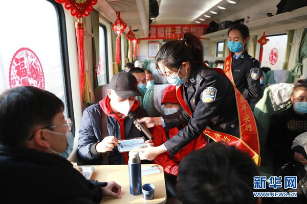 春運(yùn)臨近,包頭鐵路公安處組織開(kāi)展“鐵警相伴 平安相隨”主題宣傳活動(dòng)。1月25日,在由包頭開(kāi)往南寧的Z338次列車(chē)上,包頭鐵路公安處民警以豐富多彩的文藝演出為載體,進(jìn)行春運(yùn)出行防疫知識(shí)宣傳。 新華社發(fā)