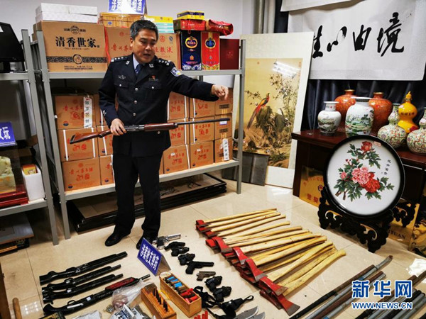 陜西省武功縣公安局局長(zhǎng)李寧展示以蔡國(guó)強(qiáng)等人為首的黑社會(huì)性質(zhì)組織案件中的一把涉案槍支(2020年11月5日攝)。新華社記者 姚友明 攝