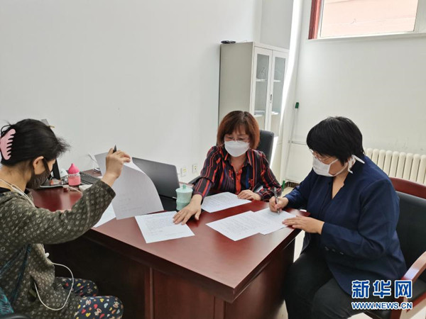 天津市和平區(qū)信訪事項(xiàng)人民調(diào)解委員會(huì)主任王玉珍(中)對(duì)雙方當(dāng)事人進(jìn)行調(diào)解(2020年5月13日手機(jī)拍攝)。新華社發(fā)