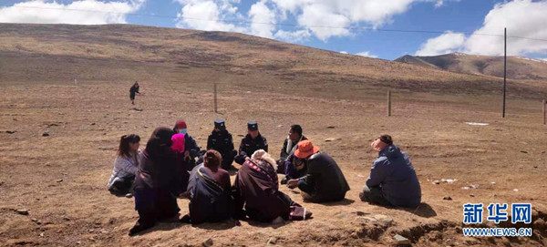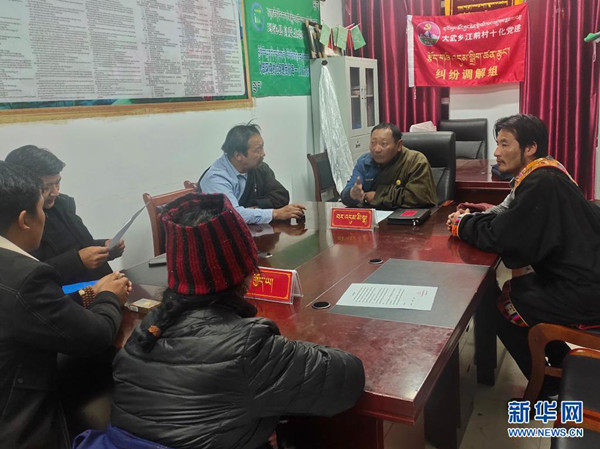 在青海省果洛藏族自治州瑪沁縣大武鄉(xiāng)江前村,糾紛調(diào)解工作組在調(diào)解牧民草場(chǎng)租賃問題(4月10日攝)。