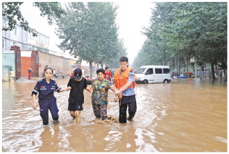 圖為河北省涿州市公安局雙塔派出所民警正在轉(zhuǎn)移受災(zāi)群眾。 本報(bào)通訊員 于波 攝