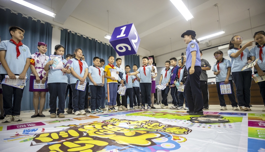 9月11日至17日,2023年國家網(wǎng)絡(luò)安全宣傳周在全國范圍內(nèi)統(tǒng)一開展。成都鐵路公安局重慶公安處組建安全宣傳小分隊到重慶科學城含谷中學校,針對網(wǎng)絡(luò)安全、電信詐騙、出行安全等,開展宣傳教育活動。圖為9月12日,民警組織學生開展“安全大富翁”互動游戲。